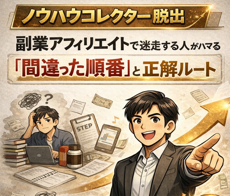 ノウハウコレクター脱出|副業アフィリエイトで迷走する人がハマる「間違った順番」と正解ルート 更新日:2026年2月20日 公開日:2026年2月19日 副業・収入アップ ノウハウコレクター脱出は「才能」ではなく「順番」で決まる 副業アフィリエイトを始めたのに、なぜか稼げない。 教材を買って、動画を見て、メモも取った。 それなりに知識も増えたはずなのに、収益はほとんど変わらない。 そして、 […] 続きを読む